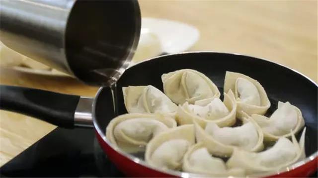 ④開始進入煎餛飩階段,首先在平底鍋倒入適量的色拉油,量不需要多,能鋪平鍋底就行;